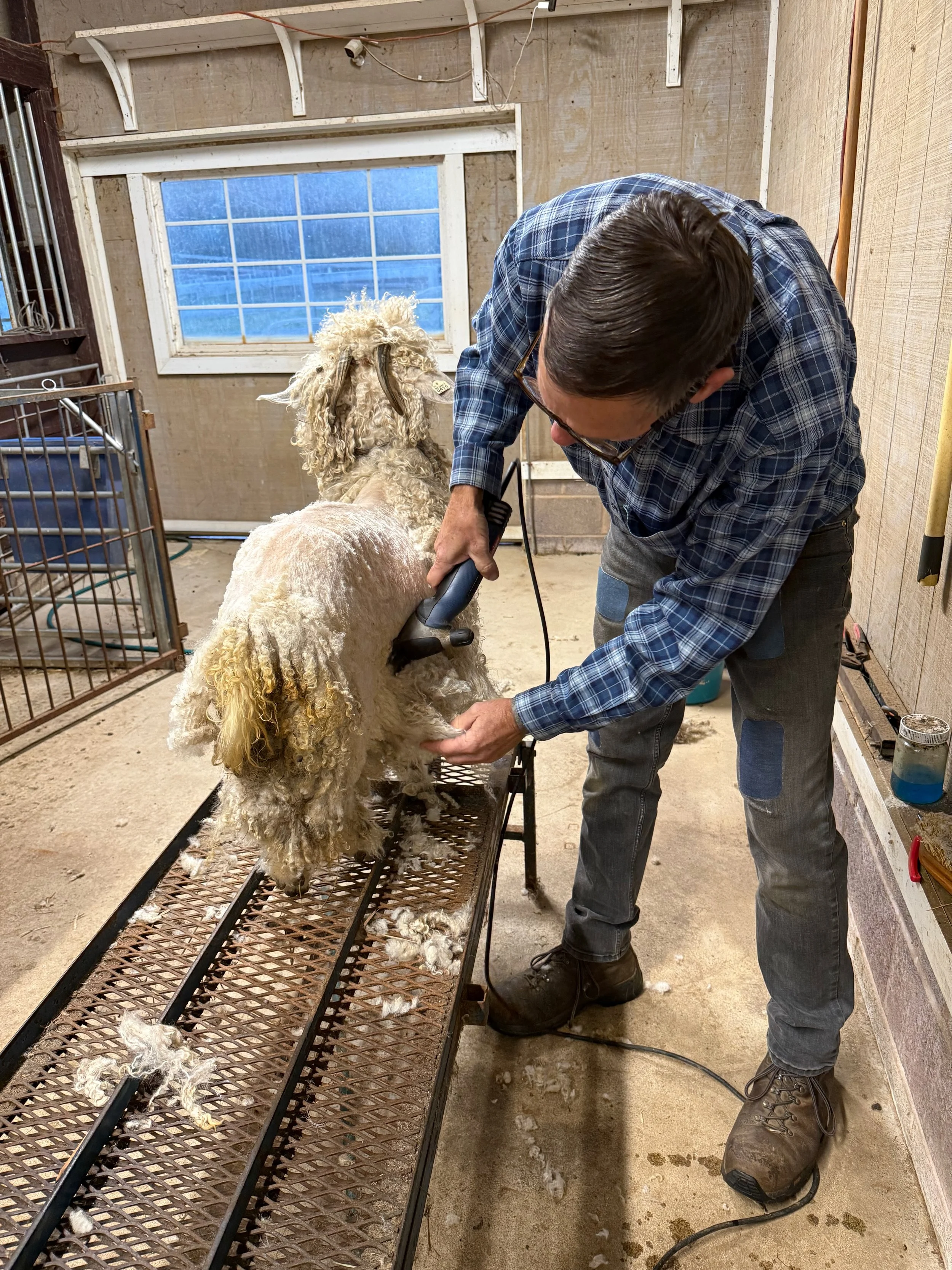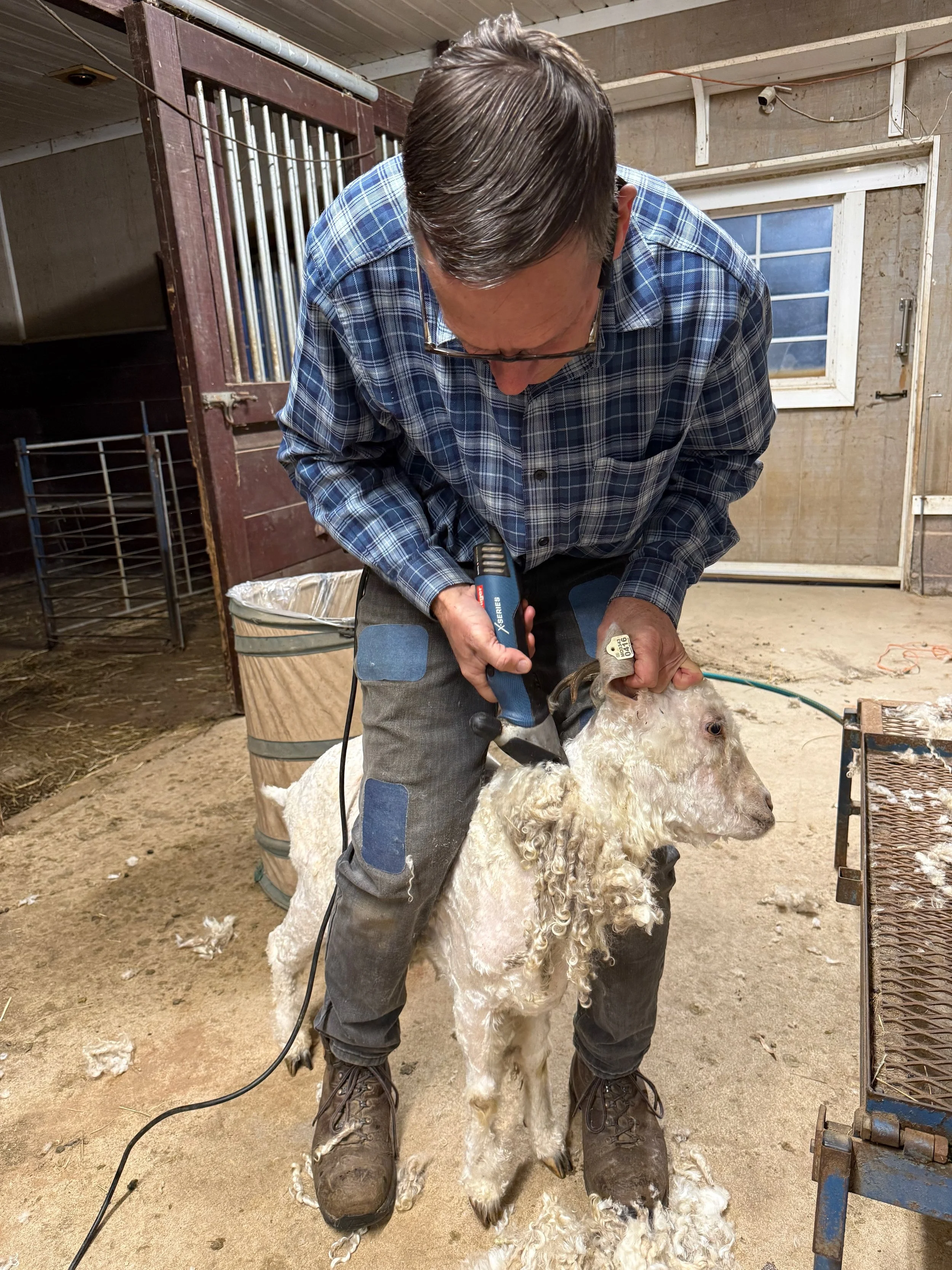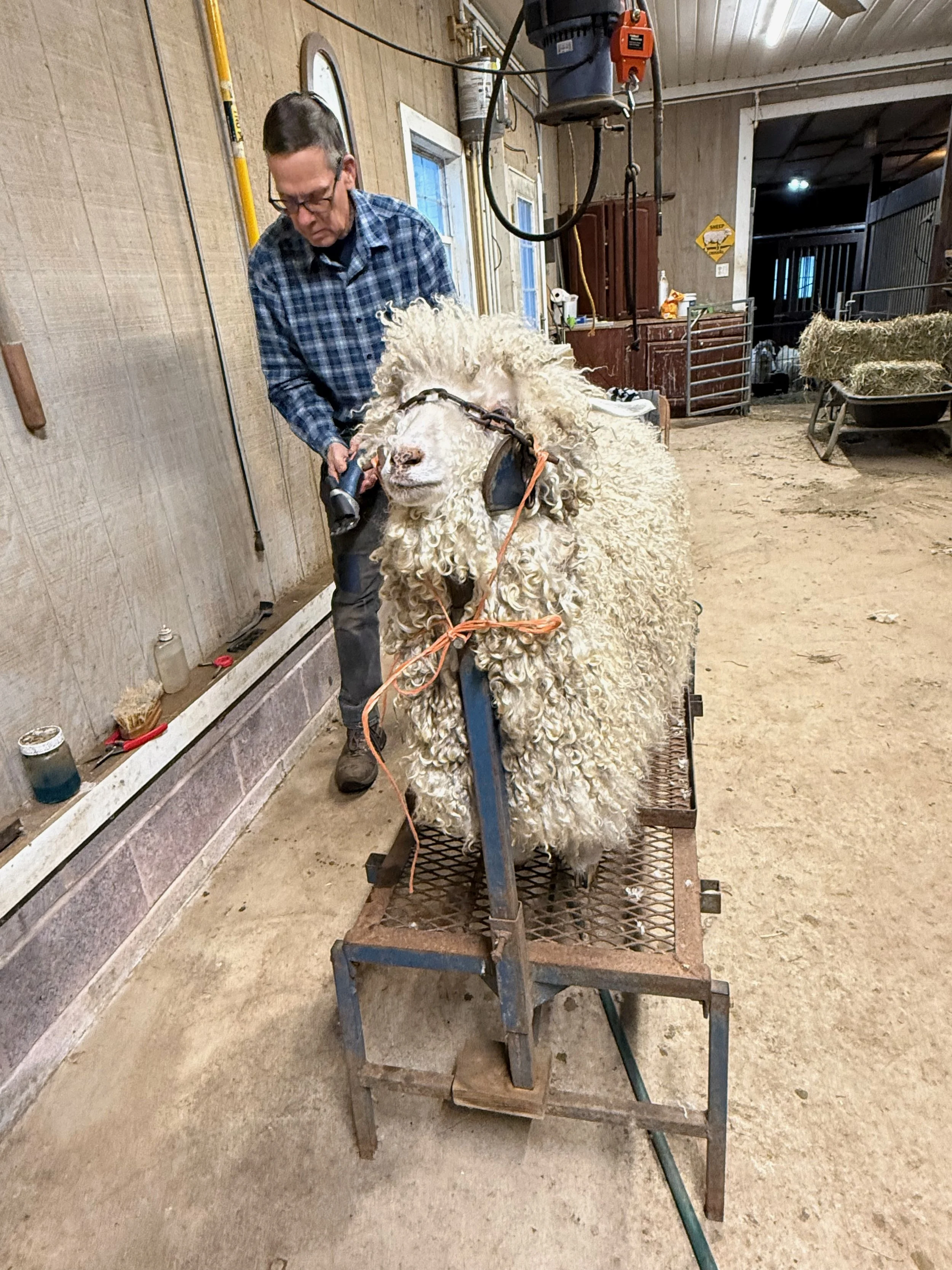 I usually only shear 2 goats a day (as my hand starts to get tired after 2). I have 19 goats so it takes about 9 days to get them all done. Most of the goats are cooperative. However, the kid goats, especially if it is the first shearing, fidget a lot. Once shorn, I also treat the goat with ivermectin to help control the lice they can sometimes get. (BTW, the lice that can infest a goat cannot affect a human.) The end result of this, of course, is a fleece that then needs to be processed to produce the lovely and lustrous mohair that ends up in the yarn and other products from Withers Wool and Farm.
