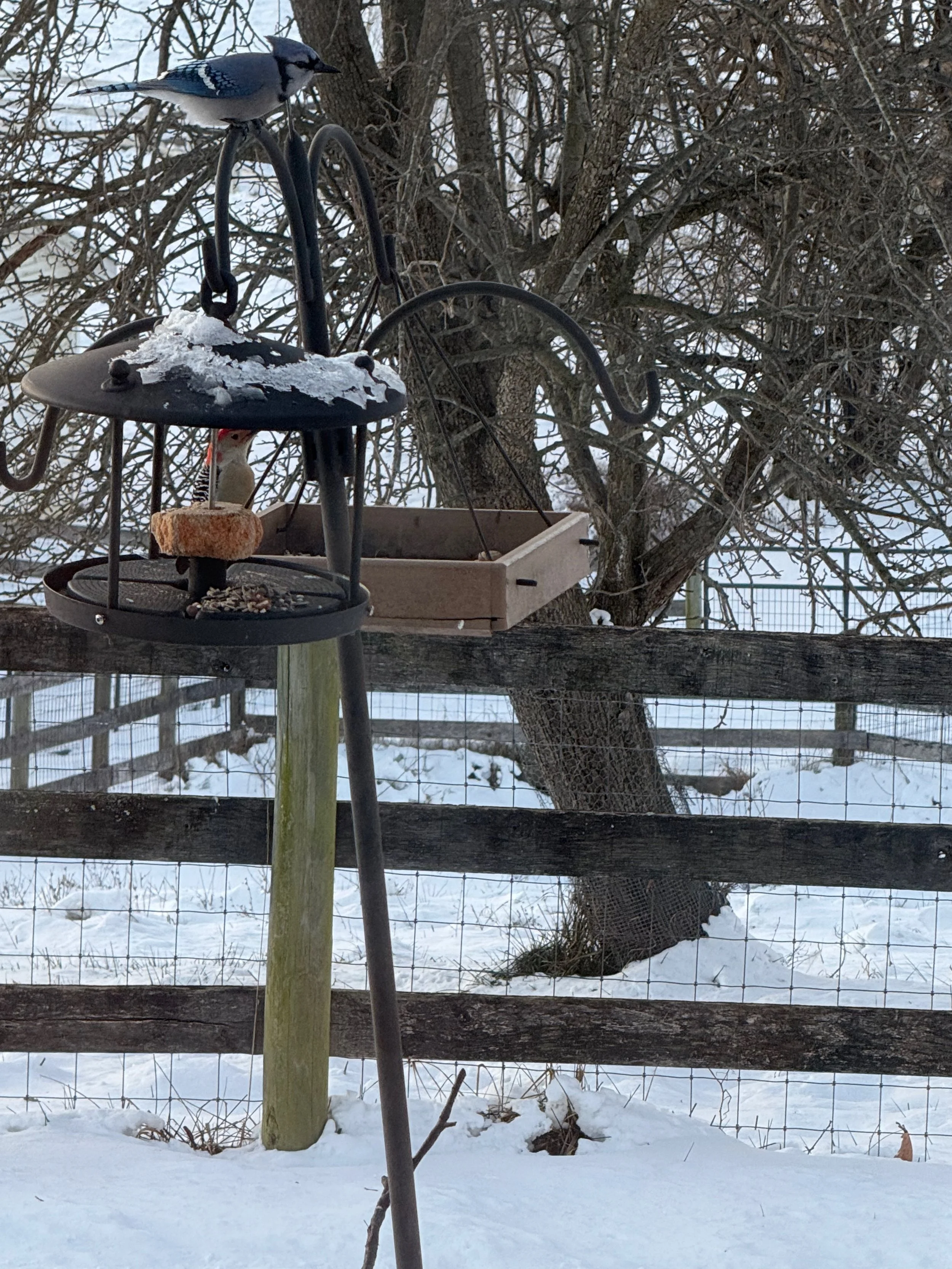 I put out food for the wild birds year round and during the cold months, especially when snow is on the ground, I put out extra food for them. My favorite birds to watch are the Blue Jays; I put peanuts out for them and they quickly fly over to pick them up and fly off to enjoy a snack.
