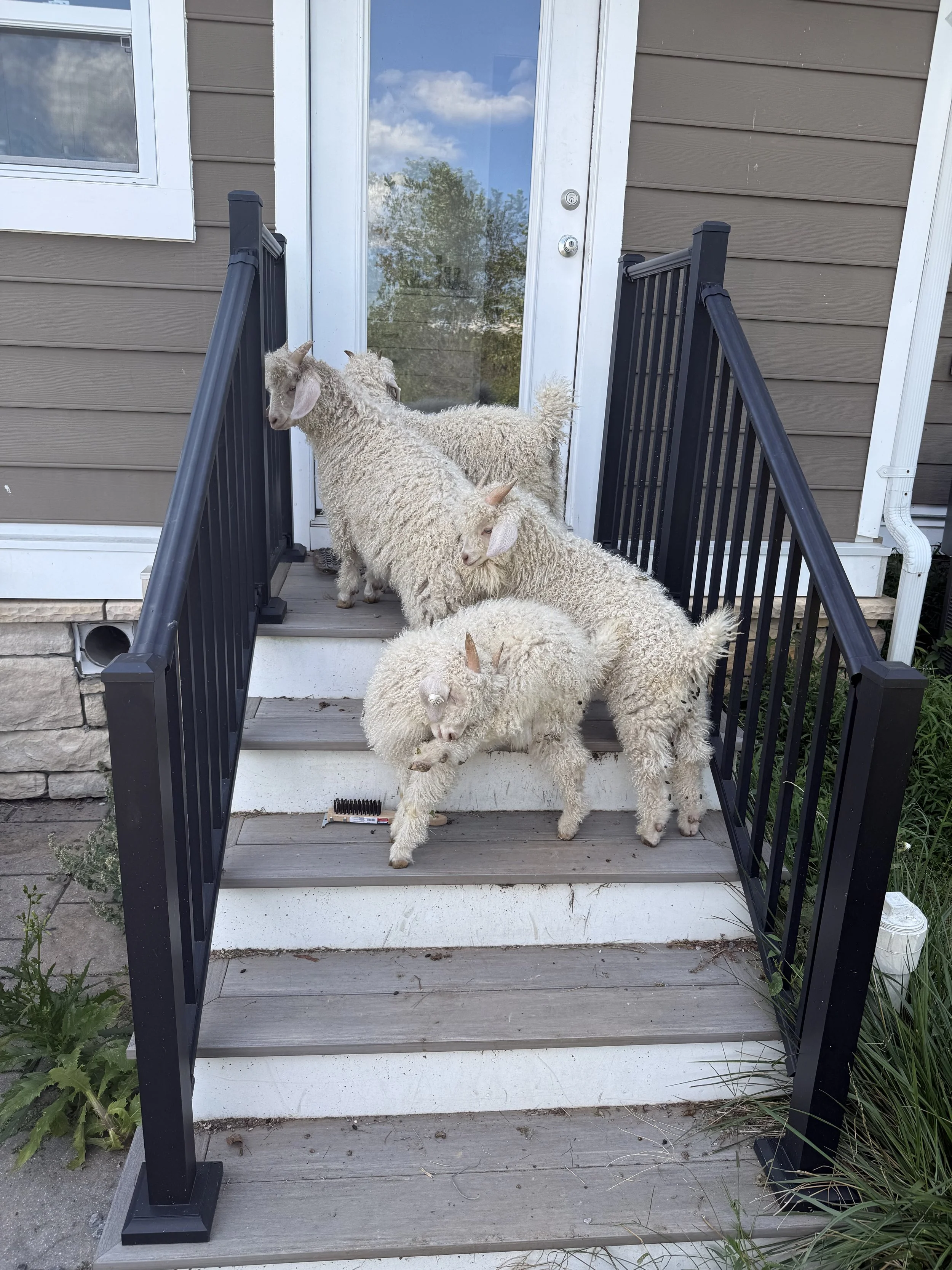 Kid goats checking out the stairs and house