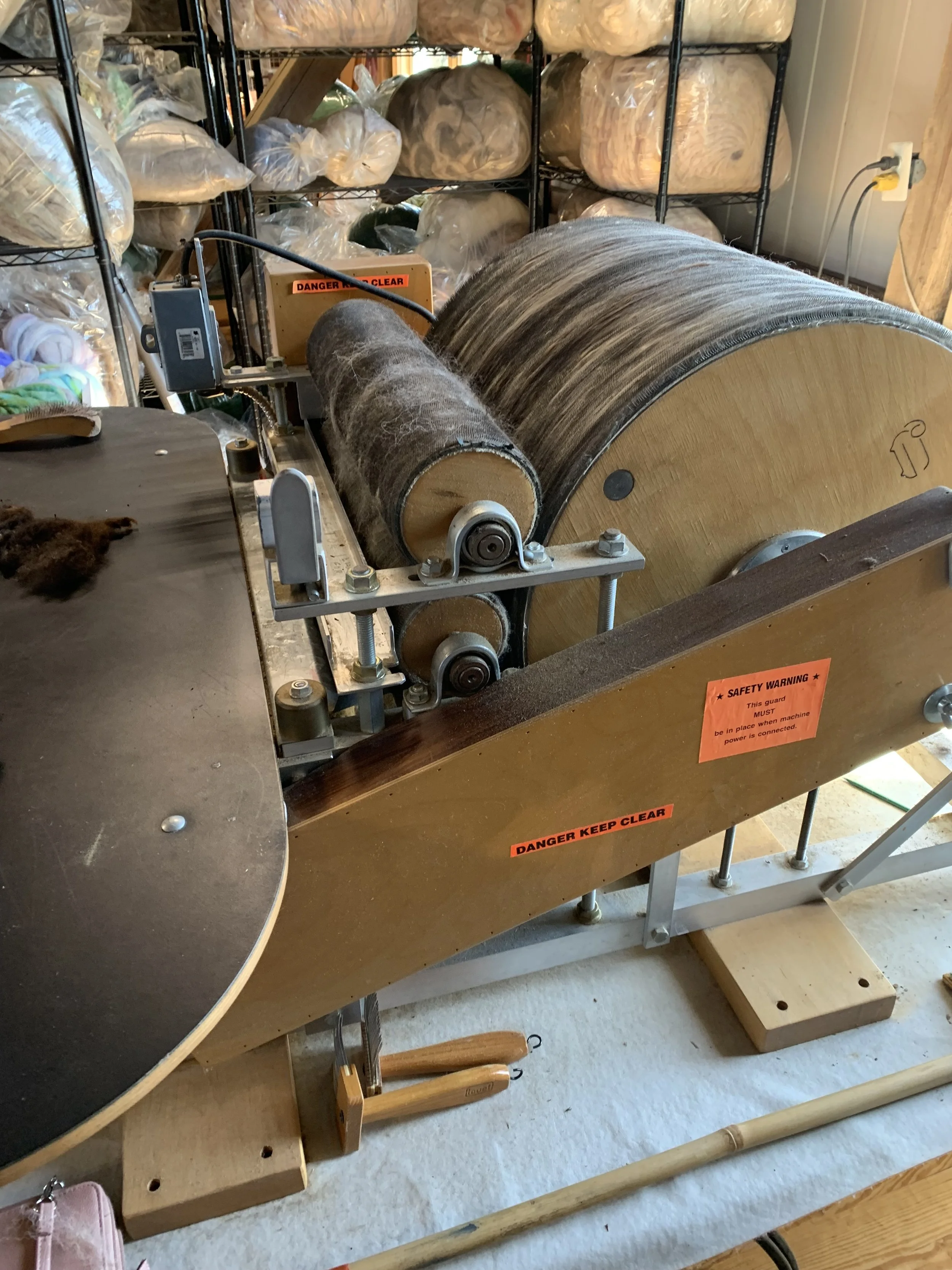 A $30 one hour workshop on how to use a drum carder to create a batt. You can either bring your own raw fiber or utilize fiber from the shop (at cost). You will learn how to prepare the fiber to feed through the carder, how to blend fiber to produce the batt you desire, and how to create interesting special affects. (After taking the workshop, you can utilize the carder for $25 an hour.)