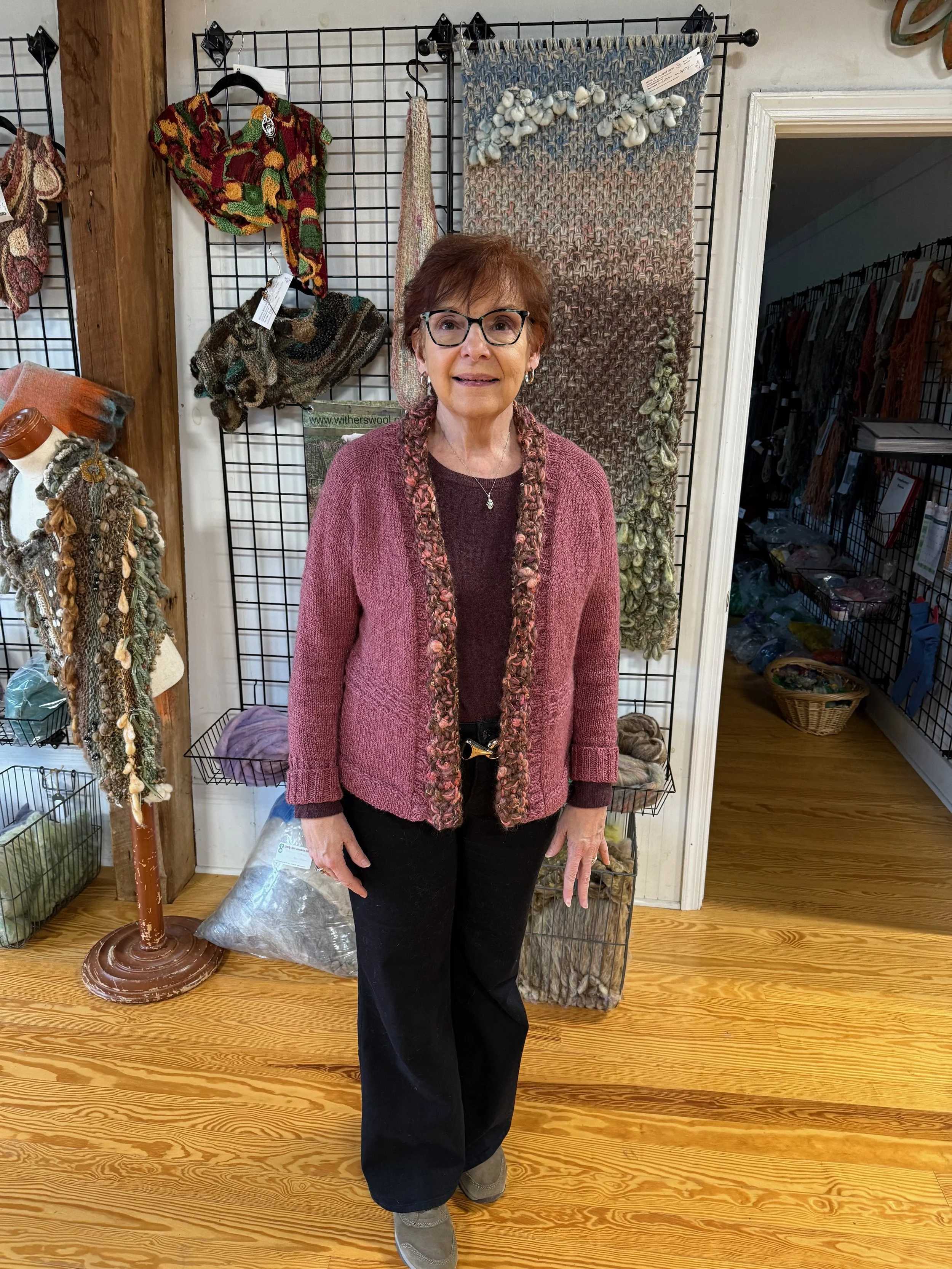 This is an stunning (open) cardigan following a pattern from Ravelry. This is knitted using 4 DK raspberry mill spun yarns from Withers Wool as well as one art yarn. Trish had to modify the pattern to work in the art yarn.